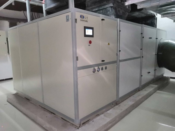 地下工程與地面工程相比,一個(gè)很突出的問題就是潮濕。在夏季,地下工程內(nèi)外空氣比焓差很大,普通除濕機(jī)沒有足夠的制冷量把新風(fēng)露點(diǎn)溫度控制得足夠低,難以保證新風(fēng)進(jìn)入地下工程后不結(jié)露,從而給通風(fēng)除濕系統(tǒng)的設(shè)計(jì)和運(yùn)行帶來諸多問題;同時(shí)室內(nèi)處理好后的適宜空氣直接排至室外也會(huì)造成能源的極大浪費(fèi)。