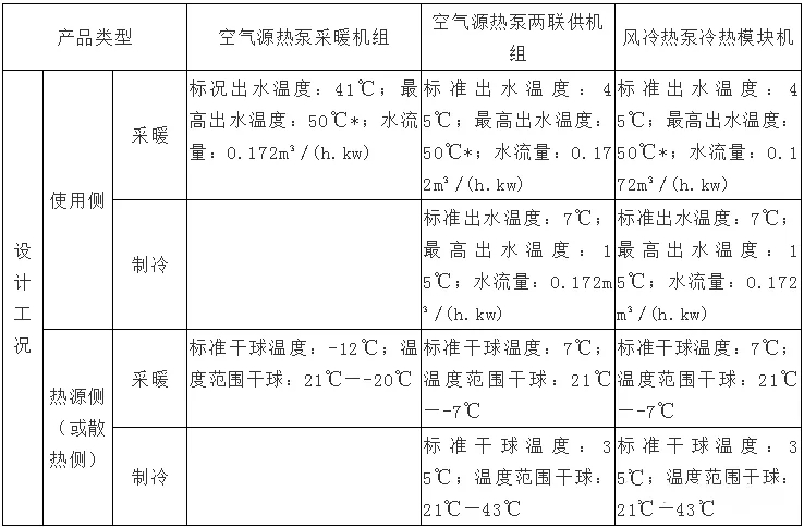 其實(shí),對于空氣源熱泵兩聯(lián)供機(jī)組來說現(xiàn)在市場上一般會按使用區(qū)域不同分為低溫機(jī)和常溫機(jī),低溫機(jī)也參照GB/T25127.1或GB/T25127.2常溫機(jī)參照表中所列。