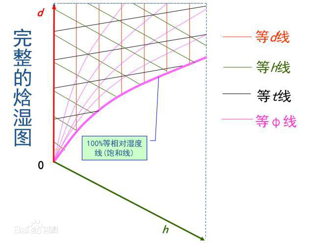 下圖為濕空氣焓濕圖(部分)的示意圖(圖片來源百度百科)。 該圖是以1kg干空氣的濕空氣為基準繪制的。不同大氣壓的焓濕圖是不同的。焓濕圖上有幾種等值參數線:等焓(h)線—與縱坐標成135°角的直線;等含濕量(d)線—平行縱坐標軸的直線;等干球溫度(t)線—近似水平的直線;等相對濕度(Ø)線—圖中的曲線;等濕球溫度線近似與等焓線平行,圖中未表示;水蒸氣分壓力(pw)與d成單值函數關系,其值表示于d的上方,等pw線平行于等d線;圖的右下方給出了熱濕比ε的方向線,熱濕比又稱角系數。