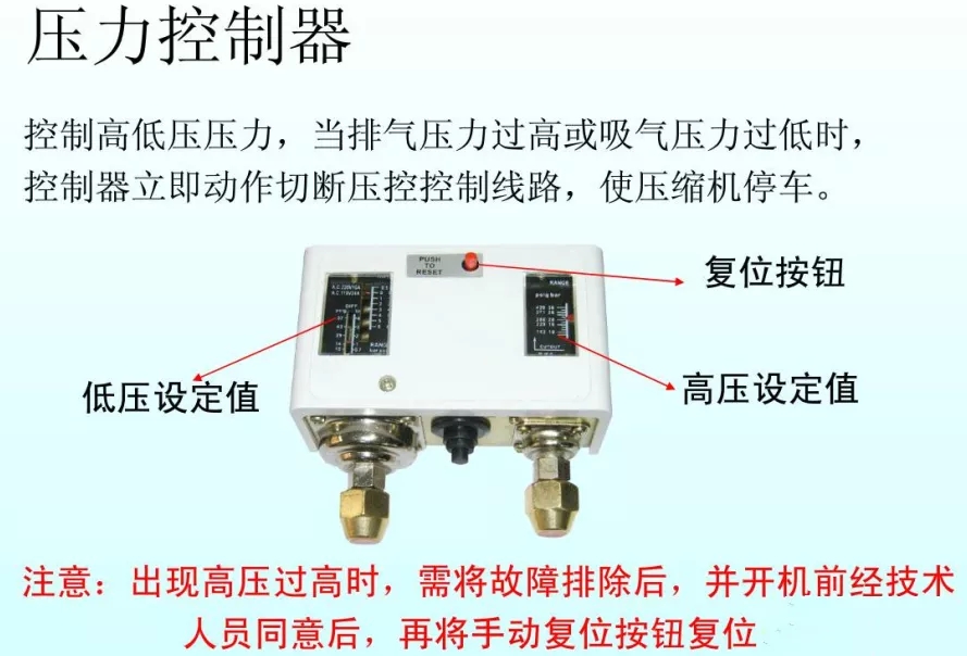 機(jī)械式壓力控制器屬于制冷機(jī)組壓力的控制的元器件,在制冷系統(tǒng)中主要用作高壓/低壓/高低壓壓力控制器。使用方法簡單,在壓力控制器上面設(shè)定一個(gè)壓力,以高于或者低于此壓力的壓力控制器觸點(diǎn)動(dòng)作,然后可以發(fā)出信號(hào)以保護(hù)制冷壓縮機(jī)為主。