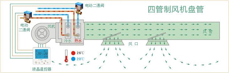 四管制空調指空調箱同時裝有冷盤管和熱盤管,每組盤管一進一回,共四根,所以叫四管制。兩組水管分別接入冷水和熱水,也就是一年四季不管什么時候,制冷制熱都可以隨時切換,可以實現一些房間供熱的同時,另一些房間供冷。并且配合末端設備能夠實現室內溫度和濕度精確控制的要求;由于冷水和熱水在管路和末端設備中完全分離,有助于系統的穩定運行和減小設備的腐蝕;所以它的標準高,成本也高。所以全年運行過程中,供冷和供熱工況頻繁交替轉換或需同時使用的空氣調節系統,宜采用四管制水系統。它較適合于內區較大,或建筑空調使用標準較高且投資允許的建筑中。