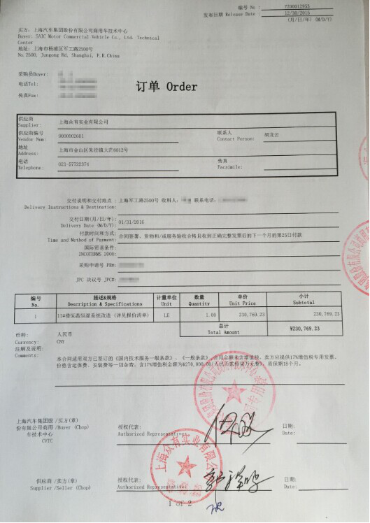 上海汽車集團股份有限公司商用車技術中心向上海眾有實業(yè)有限公司下采購訂單