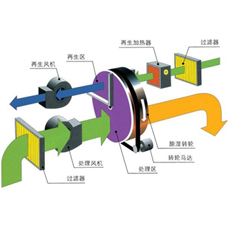 同時,在再生區域,另一路空氣先經過再生加熱器后,變成高溫空氣(一般為100~140度)并穿過吸濕后的轉輪,使轉輪中已吸附的水份蒸發,從而再生空氣因水份的蒸發而變成濕空氣,同時溫度下降;之后,再通過再生風機將濕空氣排除到室外。